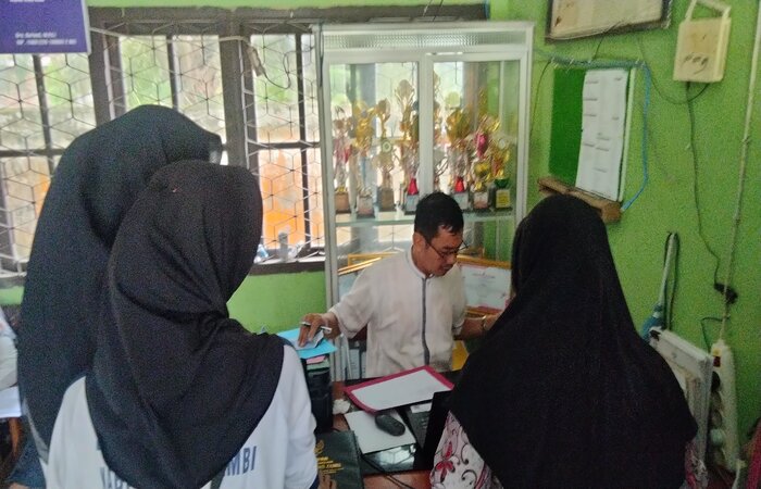Muaro Jambi (MTsN 1 Muaro Jambi), Selasa 8-10 Juli 2024 staf tata usaha membuka pelayanan daftar ulang untuk peserta didik baru dan siswa lama. Hari ini merupakan hari kedua proses daftar ulang. Suasana di lokasi pendaftaran dipenuhi oleh siswa dan orang tua mereka yang antusias untuk mengikuti proses daftar ulang. Proses pendaftaran ulang berjalan dengan lancar di ruang tata usaha. Para petugas yang melayani daftar ulang terdiri dari 3 staf tata usaha.