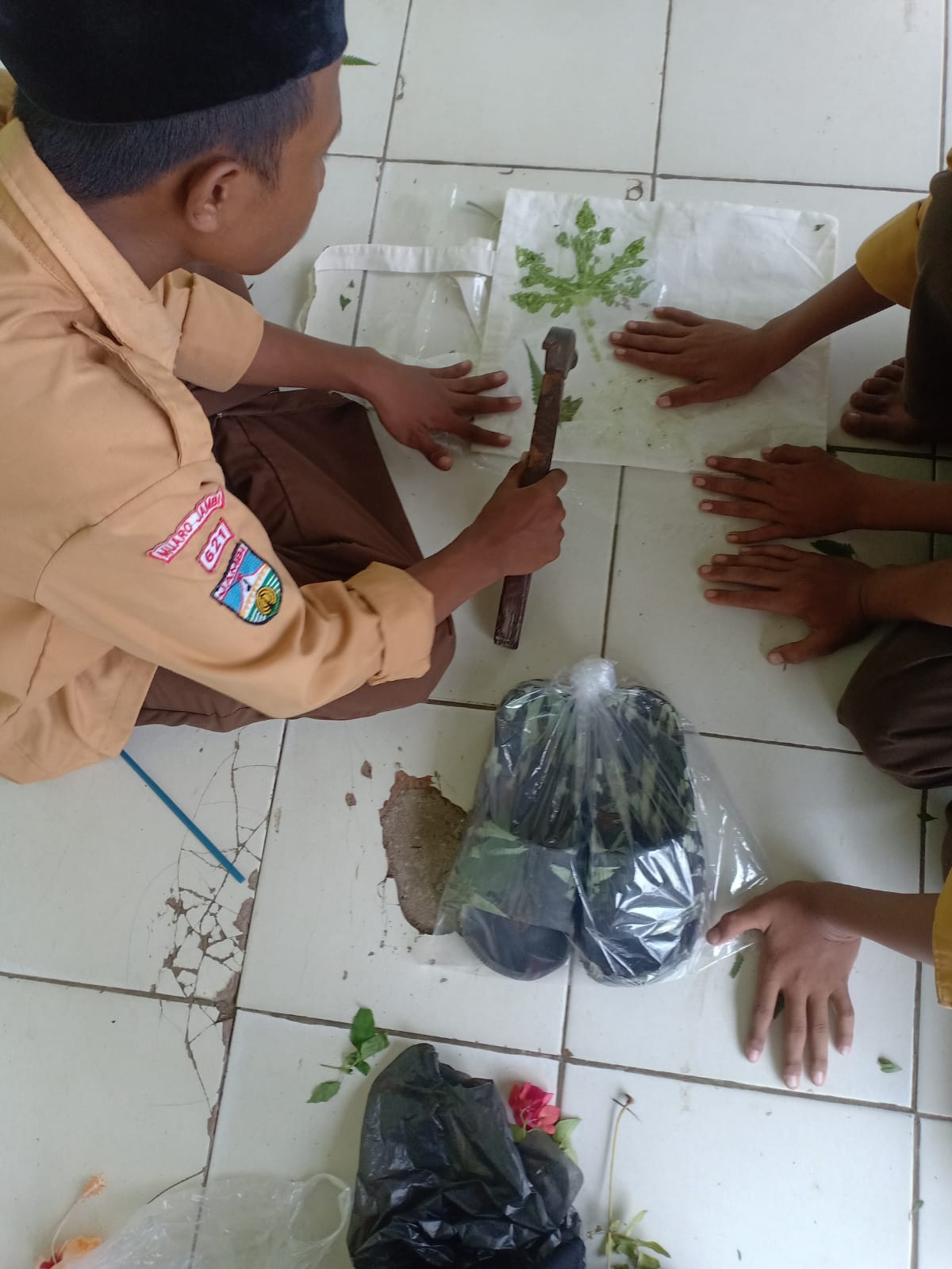Kegiatan ecoprint diampu oleh ibu Munjiah, S.Ag. Adapun tujuan dari kegiatan ini adalah menumbuhkan rasa cinta produk dalam negeri, rasa kepedulian terhadap lingkungan, dan meningkatkan kerjasama antar teman untuk menciptakan produk. Tampak masing-masing siswa siswi bersemangat dalam membuat batik ecoprint, dengan hati-hati mereka memukul daun di atas kain yang dialasi plastik. (anti)