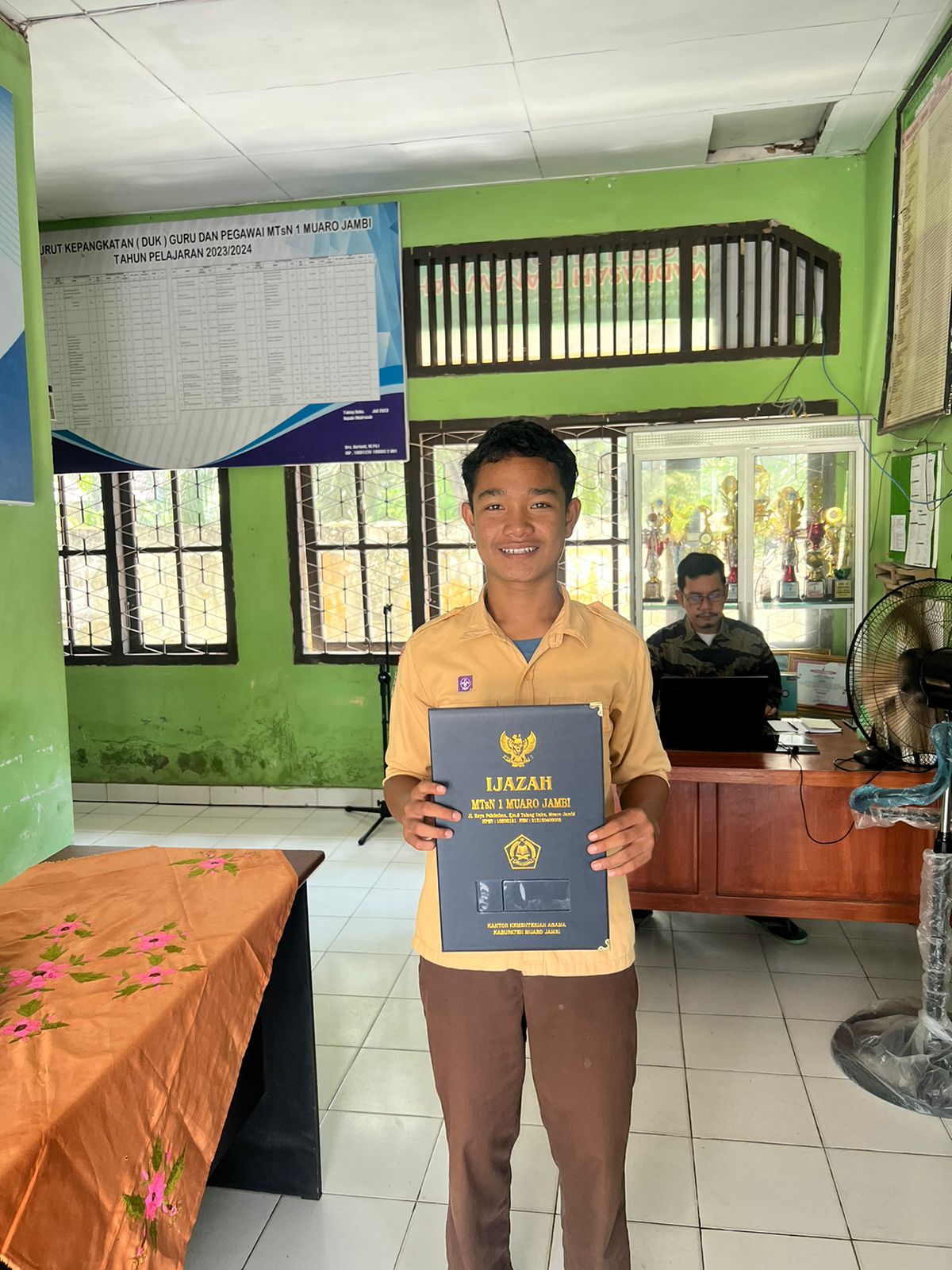 Muaro Jambi (MTsN 1 Muaro jambi) - Staf Tata Usaha MTsN 1 Muaro Jambi mulai melayani pengambilan ijazah dan cap 3 jari siswa-siswi lulusan tahun pelajaran 2023 / 2024. Sampai hari ini, Senin (23/09/2024) tercatat sudah ada puluhan lulusan yang mengambil ijazah dan melegalisasinya. Pelayanan pengambilan ijazah dilakukan di ruang Tata Usaha Madrasah pada jam kerja.