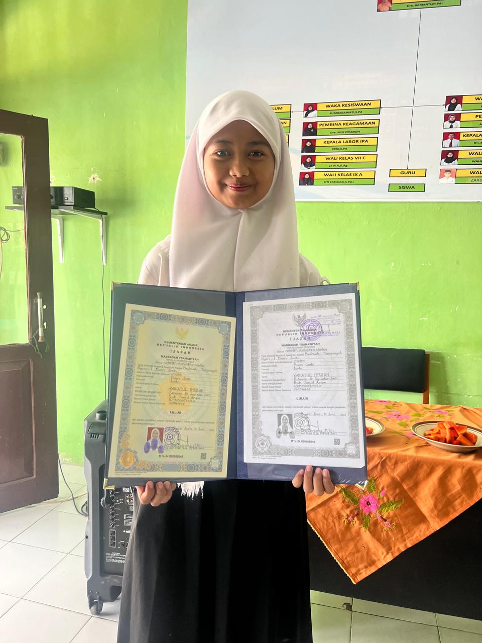 Salah satu siswa yang melakukan pengambilan ijazah di MTsN 1 Muaro Jambi, Zakiatul Imro’ah yang saat ini melanjutkan jenjang pendidikannya di MAN 3 Muaro Jambi mengucapkan syukur dan berterima kasih kepada Bapak Ibu Staf Madrasah.