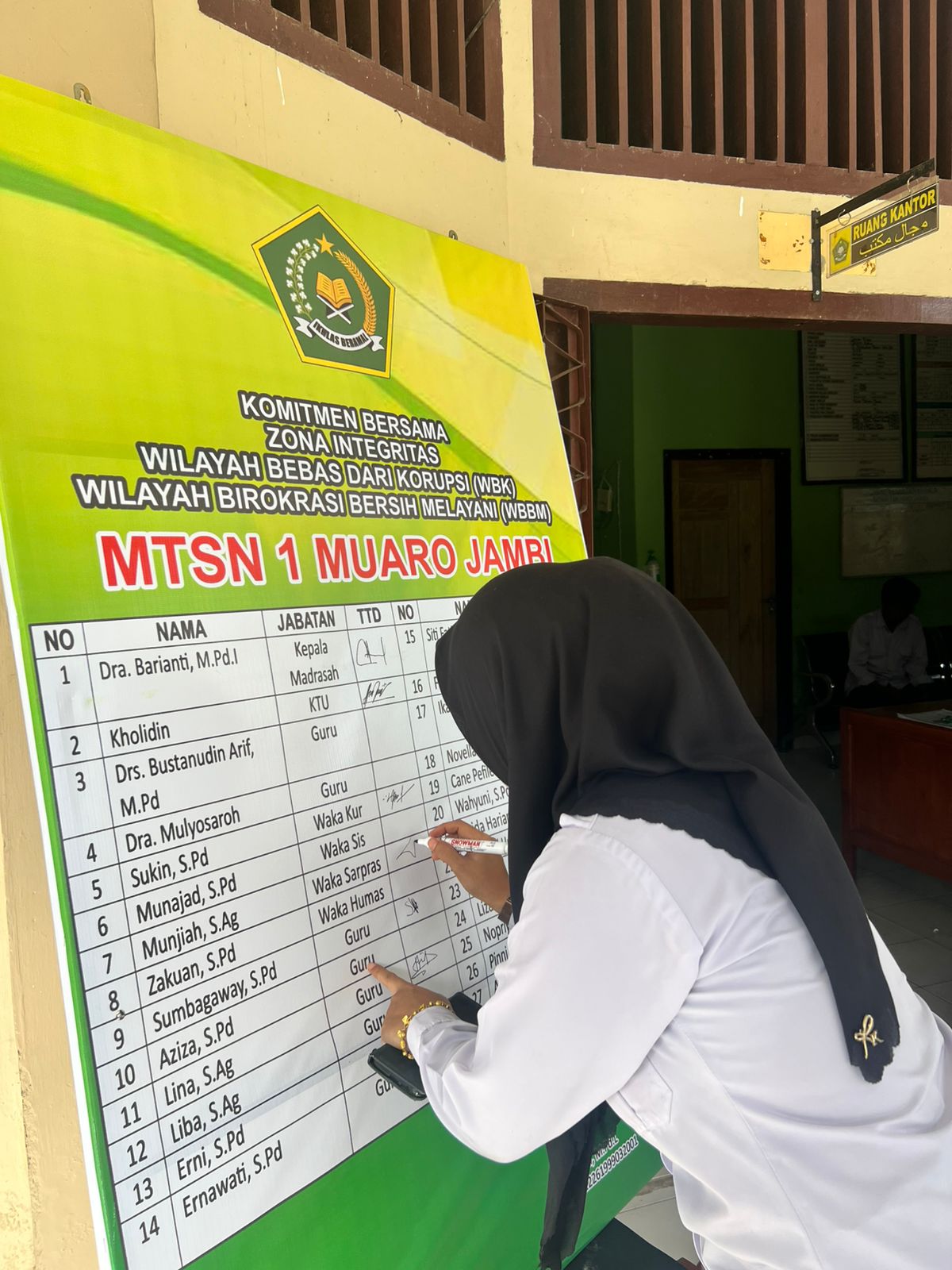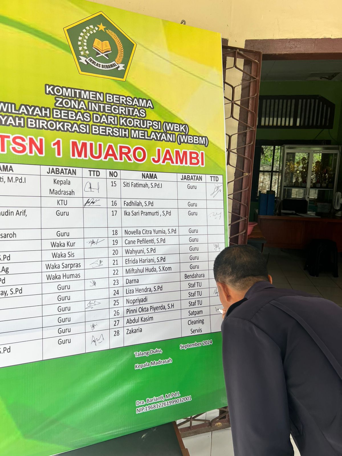 Muaro Jambi (MTsN 1 Muaro Jambi)—Dalam rangka menguatkan kembali komitmen bersama dalam Pembangunan Zona Integritas Wilayah Bebas Korupsi (ZI WBK), MTsN 1 Muaro Jambi menggelar penandatanganan Pakta Integritas. Penandatanganan tersebut dilaksanakan di depan Kantor Tata Usaha MTsN 1 Muaro Jambi pada Senin (14/10/2024).