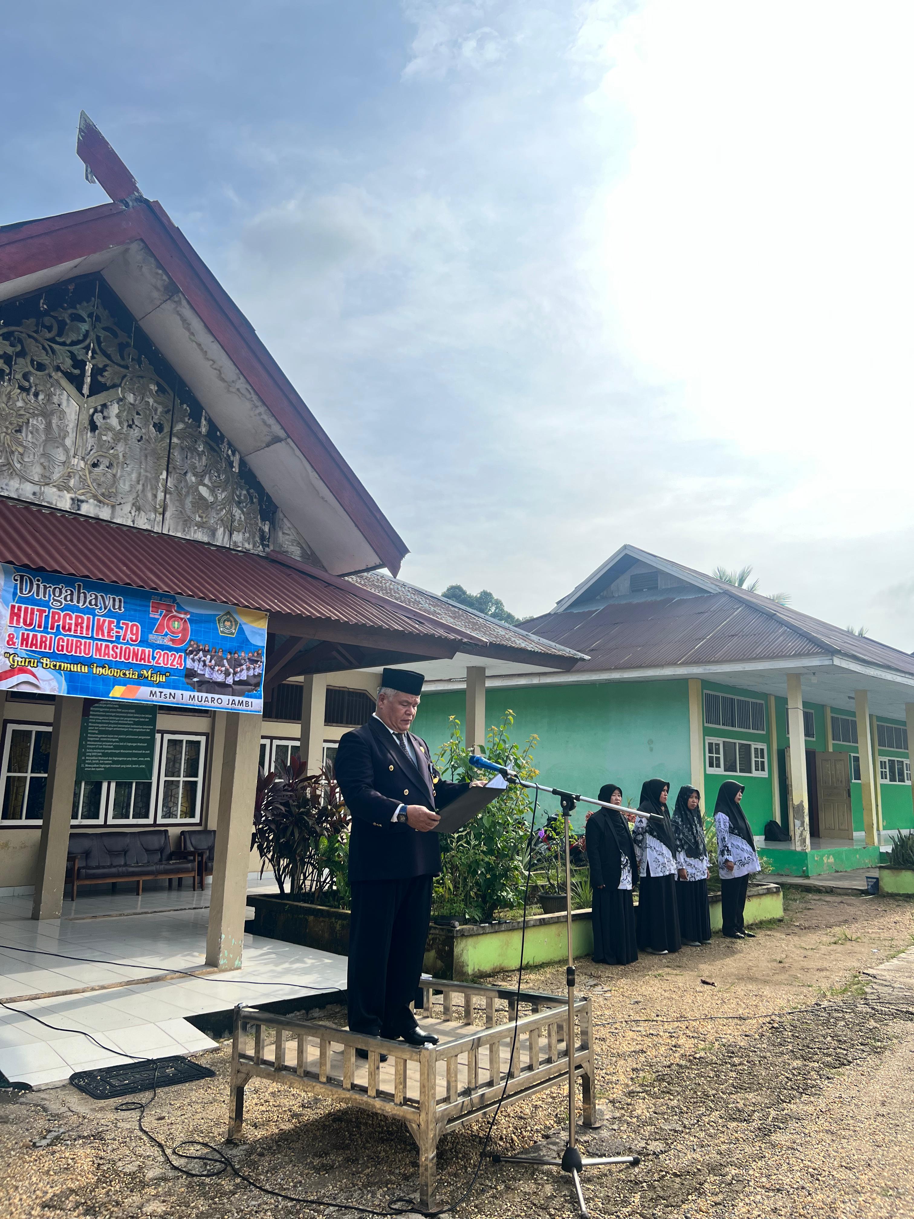 Muaro Jambi (MTsN 1 Muaro Jambi )- MTs N 1 Muaro Jambi menggelar upacara peringatan Hari Guru Nasional (HGN) ke-46 dan HUT Persatuan Guru Republik Indonesia ke-79 pada hari Senin tanggal 25 November 2024. Upacara dilaksanakan di lapangan Madrasah dan dipimpin oleh Munajad, S.Pd., Waka Kesiswaan. Upacara yang berlangsung khidmat dihadiri oleh seluruh guru, tenaga kependidikan dan siswa yang berpartisipasi dengan penuh antusias.