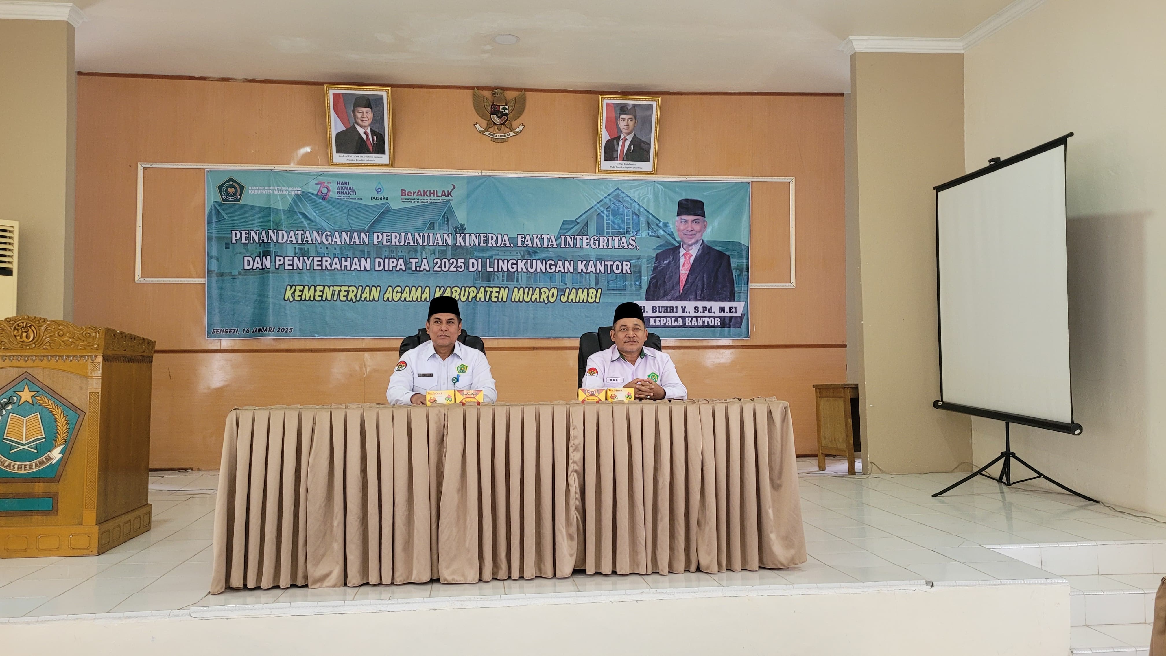Acara ini dihadiri oleh para Kasi Kantor Kemenag Kabupaten Muaro Jambi, Kepala KUA Kecamatan, dan Kepala Madrasah se-Kabupaten Muaro Jambi, termasuk Kepala Kantor Kementerian Agama Muaro Jambi, Bapak H. Buhri Y, S,Pd., M.E.I, yang juga turut menandatangani Perkin dan Fakta Integritas sebagai bentuk komitmen dalam mewujudkan tata kelola pemerintahan yang baik. Penandatanganan ini merupakan agenda tahunan yang bertujuan untuk meningkatkan akuntabilitas, transparansi, dan integritas dalam pelaksanaan tugas dan fungsi instansi pemerintah, khususnya dalam lingkup pendidikan di bawah naungan Kementerian Agama.