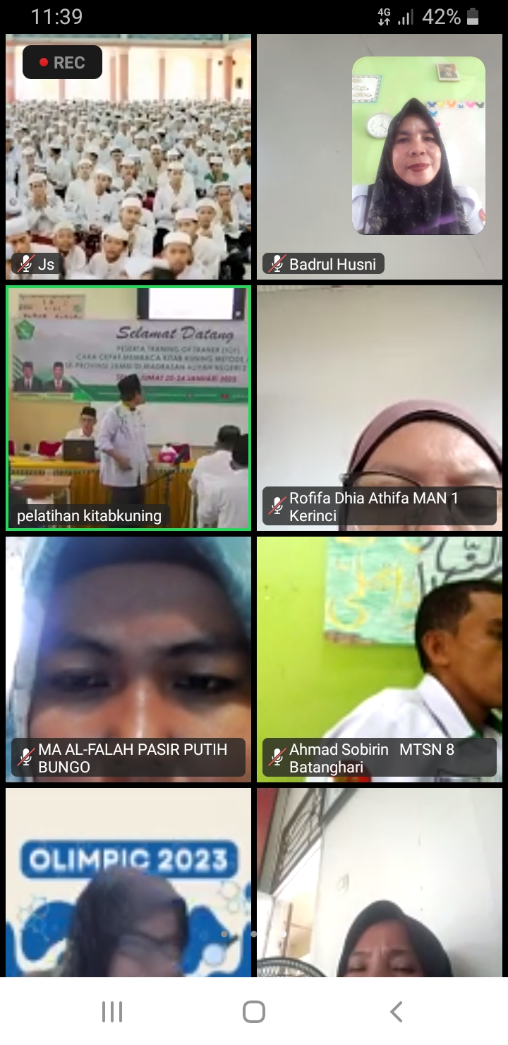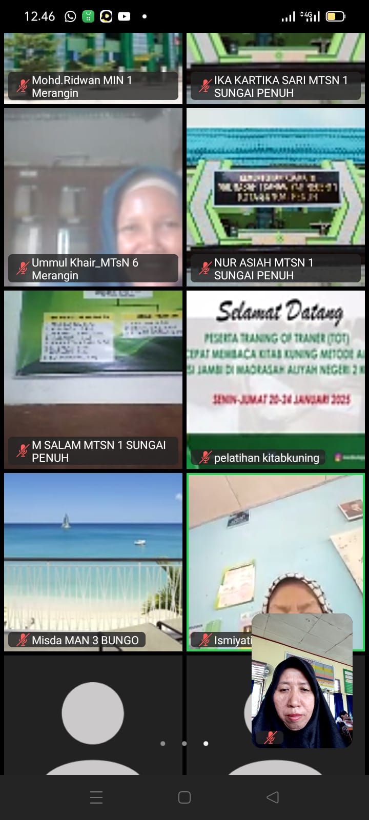 Muaro Jambi (MTsN 1 Muaro Jambi) – Senin, 20 Januari 2025 – Kanwil Kemenag Provinsi Jambi mengadakan pelatihan kitab kuning untuk guru mata pelajaran agama dan bahasa Arab pada tanggal 20 s.d 24 Januari 2025. Setai Guru PAI dan Bahasa Arab MTsN 1 Muaro Jambi siap mengikuti walaupun menggunakan hp masing-masing.