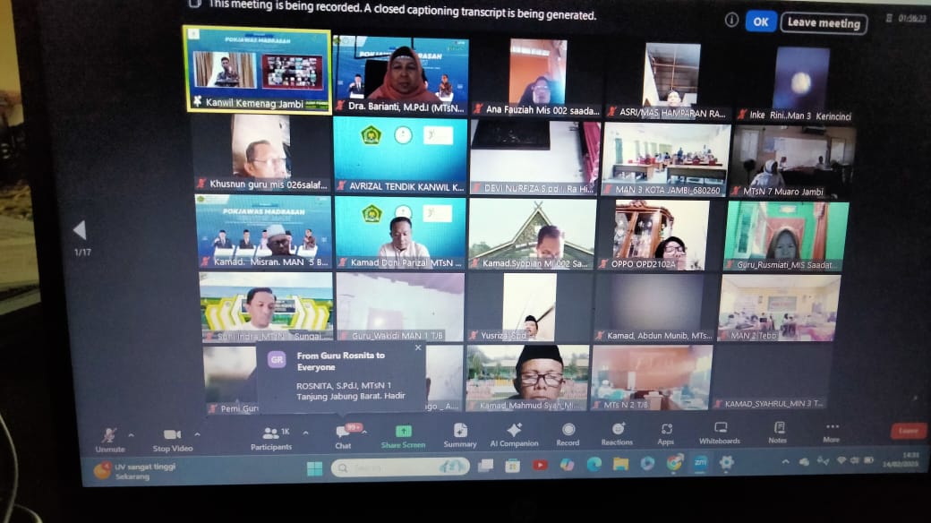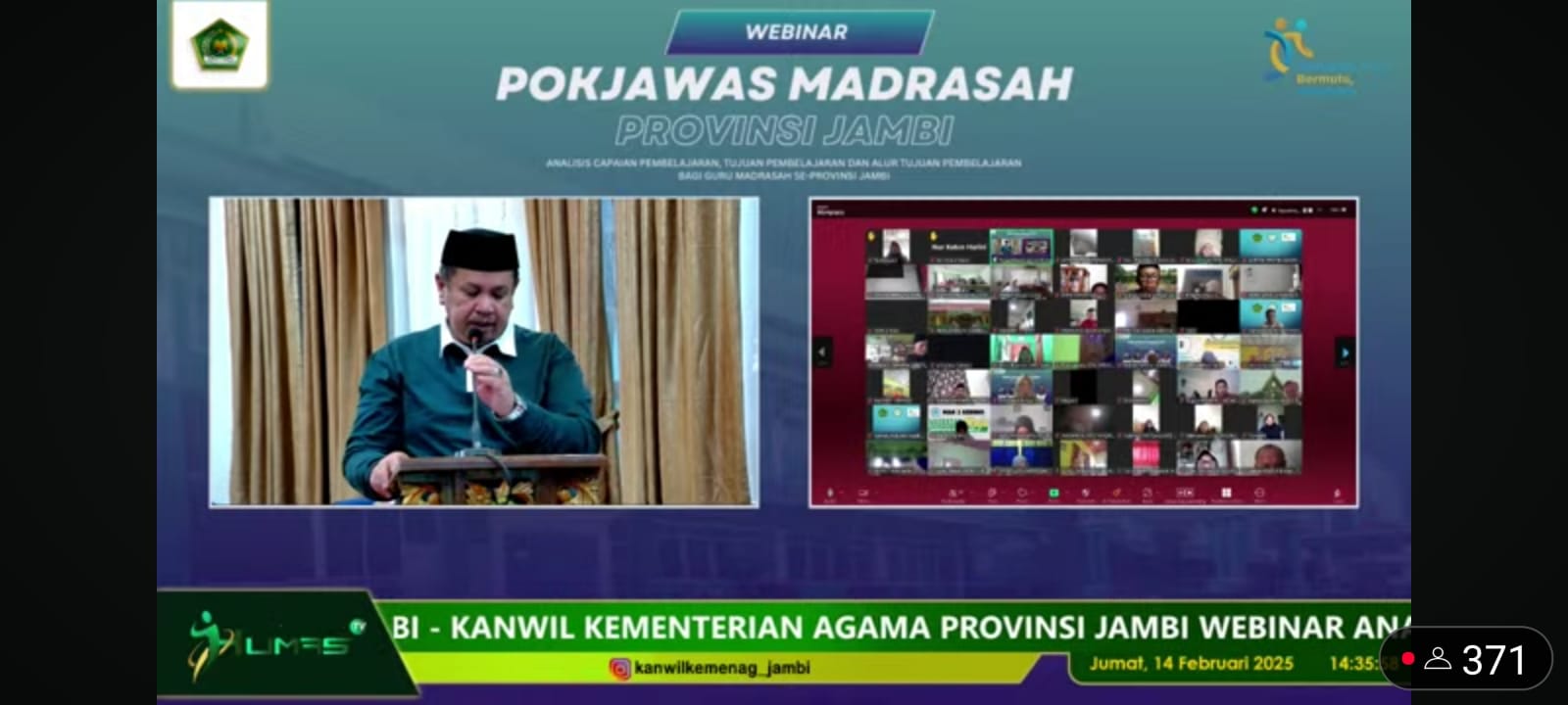 Menghadirkan Narasumber DR. M. Sidik, S.Ag, M.Pd., Ka. Kanwil Kemenag Provinsi Jambi, DR. H. Mahbub Daryanto, M.Pd, Kabid Penmad Kanwil Kemenag Provinsi Jambi DR.H. Dedi Irama Silalahi, M.A.B, Kasi Penmad Kanwil Kemenag Provinsi Jambi Avrizal, S.E, M,E dan Ketua Pokjawas Alimuddin, S,Pd., M.Pd.I, kegiatan webinar dilaksanakan secara daring melalui Zoom Meet dan kanal Youtube Madrasah Jambi, Jum’at (14/02/2025).