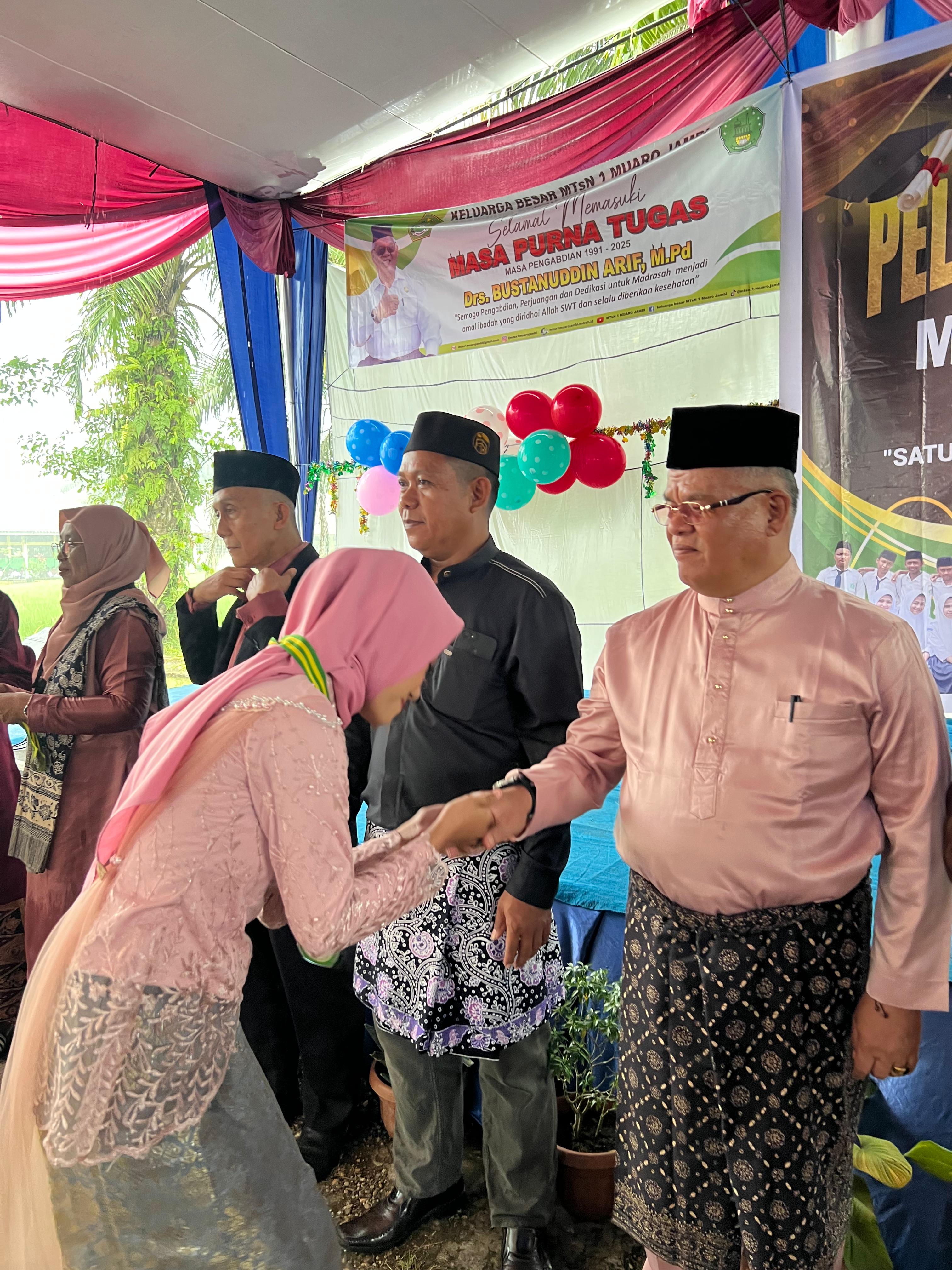 Muaro Jambi (MTsN 1 Muaro Jambi) – Pada Rabu, 28 Mei 2025 MTsN 1 Muaro Jambi melepas hari terakhir seorang guru tercinta, Drs. Bustanuddin Arif, M.Pd, yang selama ini mengampu mata pelajaran Aqidah Akhlak dengan penuh haru. Hari ini adalah hari terakhir bagi beliau melaksanakan tugasnya di madrasah karena mulai 1 Juni 2025 sudah memasuki purna tugas. Acara pamitan yang dilaksanakan berbarengan dengan tasyakuran siswa-siswi kelas IX menjadi momen bagi haru bagi seluruh warga madrasah.