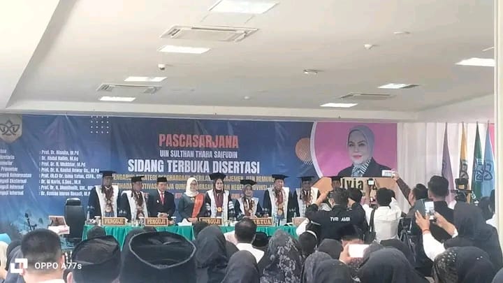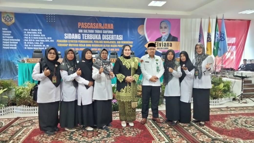 Muaro Jambi (MTsN 1 Muaro Jambi) – Dalam rangka memenuhi undangan Kepala Madrasah dan majelis guru MTsN 1 Muaro Jambi menghadiri Sidang Ujian Promosi Dra, Hj. Elviana, M,Si. untuk memperoleh gelar Doktor dalam bidang Manajemen Pendidikan Islam pada hari Senin (2/6/25). Acara ini berlangsung di Hotel Ballroom GTC – sutha Inn Telanai Pura Jambi, dan diikuti oleh berbagai undangan dari Gubernur Jambi, Kakanwil Kemenag Provinsi Jambi, Kakankemenag Kabupaten, Para pejabat, Para Kepala Madrasah dan Guru madrasah.