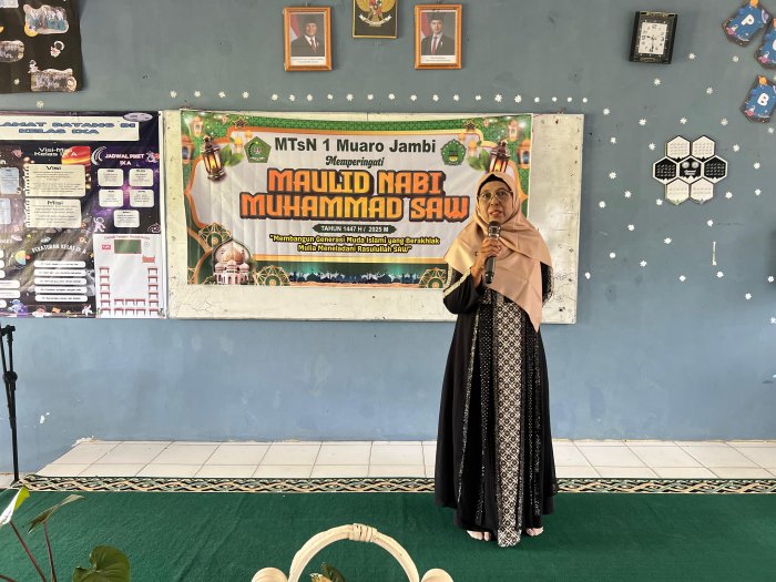 Pada Jumat, 19 September 2025, MTsN 1 Muaro Jambi menggelar peringatan Maulid Nabi Muhammad SAW 1447 H dengan suasana penuh semangat kebersamaan dan nuansa religius. Kegiatan tahun ini terasa istimewa karena seluruh rangkaian acara sepenuhnya diisi oleh para siswa. Berbagai penampilan seperti sarhil dan sholawat turut memeriahkan acara, yang bertujuan menumbuhkan kecintaan siswa kepada Rasulullah serta mempererat ukhuwah Islamiyah di lingkungan madrasah.
