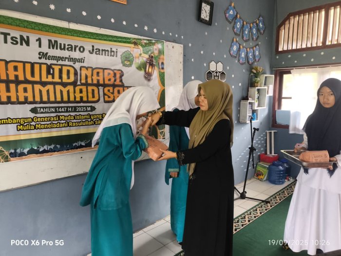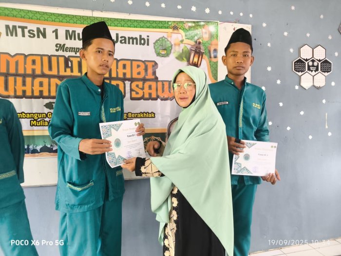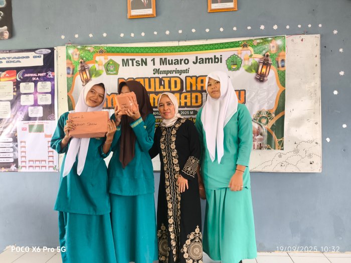 Talang Duku, 19 September 2025 - MTsN 1 Muaro Jambi menggelar acara pembagian hadiah bagi para pemenang lomba dalam rangka memperingati Maulid Nabi Muhammad SAW 1447 H. Kegiatan ini berlangsung di aula madrasah dan dihadiri oleh seluruh siswa serta dewan guru, menciptakan suasana penuh kebanggaan dan semangat kebersamaan.