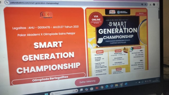 Smart Generation Championship merupakan ajang kompetisi olimpiade tingkat nasional yang bertujuan mengukur kemampuan akademik dan karakter peserta. Kompetisi ini memberikan peluang bagi siswa untuk meraih prestasi di tingkat nasional, menambah wawasan, serta memperoleh penghargaan dan pengakuan. Proses lomba meliputi pendaftaran, seleksi, hingga grand final yang dilaksanakan secara daring dan luring. Selain itu, ajang ini juga menekankan pengembangan karakter dan prestasi peserta. Para pemenang di setiap jenjang mendapatkan hadiah dan penghargaan, sementara seluruh peserta memperoleh sertifikat sebagai bentuk apresiasi.