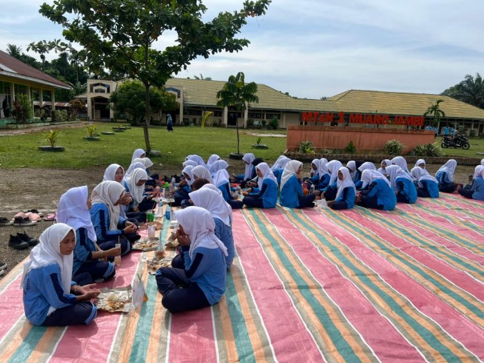 Talang Duku - MTsN 1 Muaro Jambi mengadakan gerakan sarapan sehat bersama di halaman madrasah pada Kamis, 6 November 2022. Kegiatan ini dilaksanakan sebelum jam pelajaran pertama dimulai dan diikuti oleh seluruh siswa. Para siswa membawa bekal makanan dan minuman dari rumah masing-masing untuk dinikmati bersama di lingkungan madrasah. Kegiatam sarapan bersama ini dilaksanakan satu bulan sekali.