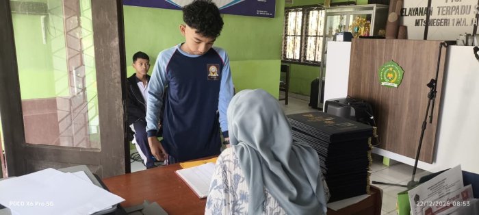 Talang Duku - Suasana penuh haru dan kehangatan menyelimuti MTsN 1 Muaro Jambi pada Senin, 22 Desember 2025. Pada hari tersebut, para alumni angkatan 2025 datang ke kantor tata usaha untuk mengambil ijazah kelulusan mereka. Proses pengambilan ijazah berlangsung tertib dan terorganisasi berkat persiapan matang dari panitia madrasah.