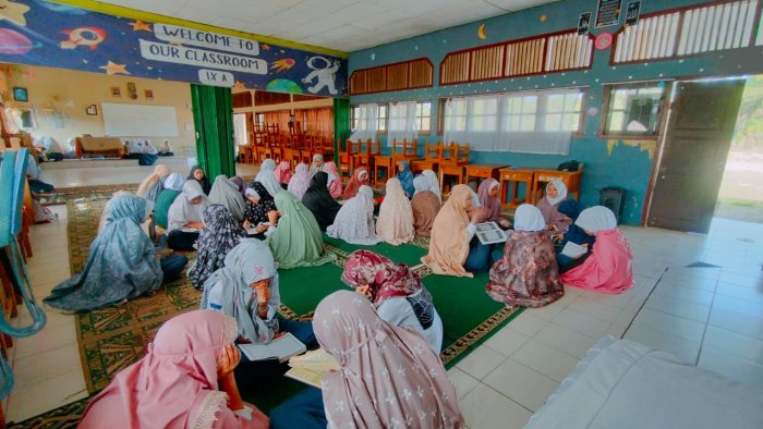Muaro Jambi, 3 Maret 2026, Guru dan siswa Madrasah Tsanawiyah Negeri (MTsN) 1 Muaro Jambi mengikuti kegiatan tadarus Al-Qur'an bersama yang berlangsung di aula utama madrasah. Kegiatan ini merupakan bagian dari program rutin yang diadakan oleh pihak madrasah untuk menumbuhkan kecintaan terhadap Al-Qur'an serta memperdalam pemahaman ajaran agama Islam di kalangan peserta didik dan tenaga pendidik.
